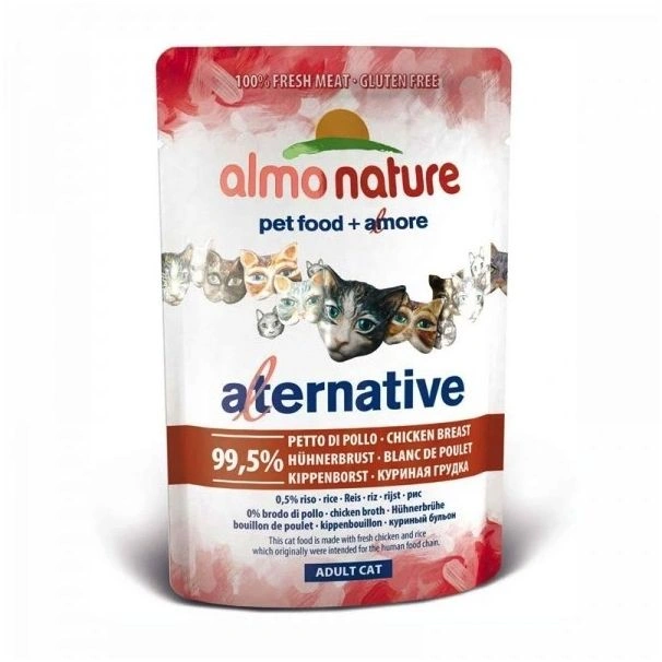 Alimento umido complementare per gatti. Il pollo rappresenta la fonte proteica di massima prevalenza, accompagnata da una minima percentuale di riso, tale da renderlo un ottimo ad alta palatabilità.