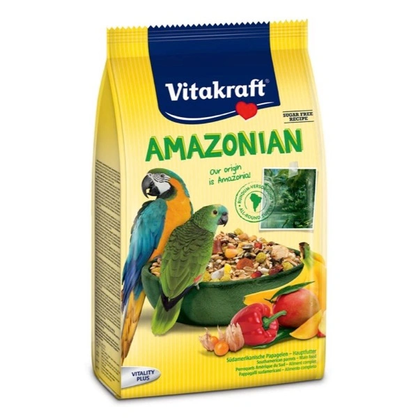 Amazonian è un alimento vario, un’autentica coccola con i migliori prodotti presenti in natura nella terra amazzonica, terra di origine di numerosi pappagalli sud americani. Il mix specifico di ingredienti naturali e gustosi, come mango, peperone e alchechengiè stato preparato con curae assicura un’alimentazione equilibrata degli uccelli. Oltre ad importanti vitamine, Amazonian contiene anche tutte le sostanze nutrienti e rigeneranti, di cui i pappagalli hanno bisogno per una vita sana. Preziosi gastroliti e pregiati ß-glucani completano la ricetta dell’alimento naturale. Il cibo dei paesi d’origine, naturalmente buono!