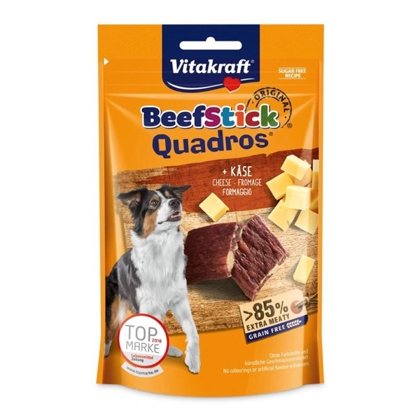 I Beef Stick® Quadros® a base di carne vengono prodotti con grande cura e attenzione secondo la ricetta originale Beef Stick®. In più, questi deliziosi rombetti contengono un raffinato ingrediente supplementare: irresistibili pezzetti di formaggio, riconoscibili addirittura al primo sguardo grazie all’accurato processo produttivo. Una prelibatezza assoluta per il vostro cane!