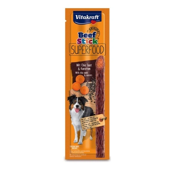 Vitakraft Beef Stick® piace a tutti i cani! Ora il popolare stick di carne è arricchito con superfood: avvolto in squisita carne e ripieno di carote ricche di carotene e semi di chia naturalmente ricchi di acidi grassi Omega-3 per favorire la salute della pelle e del pelo. Anche questa variante convince per il gusto unico e il profumo delizioso grazie al collaudato procedimento di affumicatura a freddo e l’elevato tenore di carne. Perfetto per le coccole, come premio o come spuntino tra un pasto e l’altro! Molto pratico: grazie alla confezione salva freschezza con apertura a strappo il Beef Stick® Original è ideale anche per fuori casa.