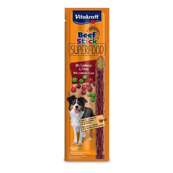 Vitakraft Beef Stick® piace a tutti i cani! Ora il popolare stick di carne è arricchito con superfood: avvolto in squisita carne e ripieno di piselli ricchi di proteine e mirtillo rosso naturalmente ricco di antiossidanti per favorire la protezione delle cellule. Anche questa variante convince per il gusto unico e il profumo delizioso grazie al collaudato procedimento di affumicatura a freddo e l’elevato tenore di carne. Perfetto per le coccole, come premio o come spuntino tra un pasto e l’altro! Molto pratico: grazie alla confezione salva freschezza con apertura a strappo il Beef Stick® Original è ideale anche per fuori casa.