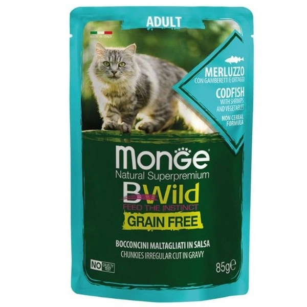 Alimento umido completo destinato a gatti adulti. L’alimento, costituito da bocconcini maltagliati in salsa, è caratterizzato da forme alternative di carboidrati non derivanti da cereali, in particolare fagiolini e carote. Il merluzzo è accompagnato dalla presenza di gamberetti, fonte proteica di alto valore biologico, e ortaggi (fagiolini e carote). Una significativa integrazione di XOS (xilo-oligosaccaridi) per il supporto del benessere intestinale, e Yucca schidigera, per il controllo dell’odore delle feci.