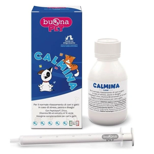Mangime complementare per cani e gatti formulato in forma fluida appetibile. Calmina è un mangime complementare con PEPTIDYSS, zinco, vitamina B6 ed estratto di tè verde (titolato in L-teanina) che concorrono a favorire il normale rilassamento dell’animale