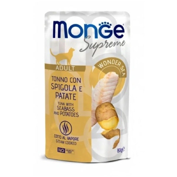 Alimento umido bilanciato complementare per gatti adulti (1+). La fonte proteica principale è rappresentata dal Tonno striato oceanico, alla quale sono state aggiunte la spigola, fonte Naturale di proteine di alto valore biologico, e patate, fonte di fibre e minerali. Il tutto è accompagnato da una percentuale di FOS (frutto-oligosaccaridi), prebiotici essenziali per il benessere intestinale.