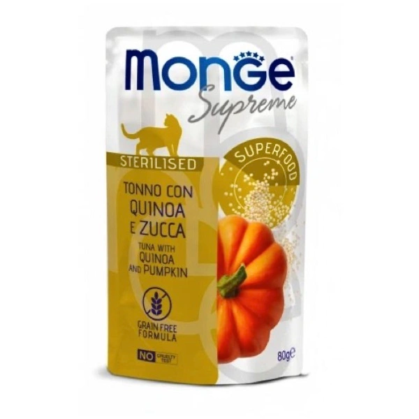 Alimento umido bilanciato complementare per gatti adulti sterilizzati. La fonte proteica principale è rappresentata dal Tonno striato oceanico, alla quale sono stati aggiunti zucca, ricca di antiossidanti e fibre, e la quinoa, superfood fonte di antiossidanti e minerali. Il tutto è accompagnato da una percentuale di FOS (frutto-oligosaccaridi), prebiotici essenziali per il benessere intestinale.