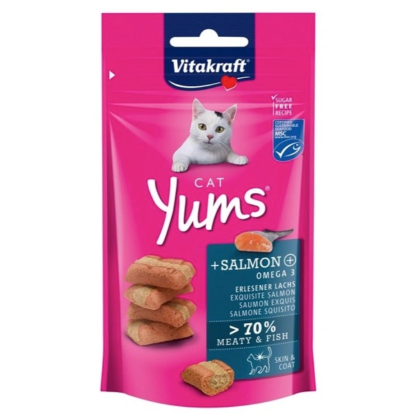I Cat Yums ricchissimi di carne con salmone pregiato e Omega-3 vengono prodotti attraverso un procedimento esclusivo, con i migliori ingredienti e la ricetta non contiene zucchero. Ogni singolo bocconcino ha un delizioso ripieno ed è cotto al forno delicatamente. I Cat Yums® sono irresistibilmente morbidi. Il vostro gatto adorerà questi snack succulenti!