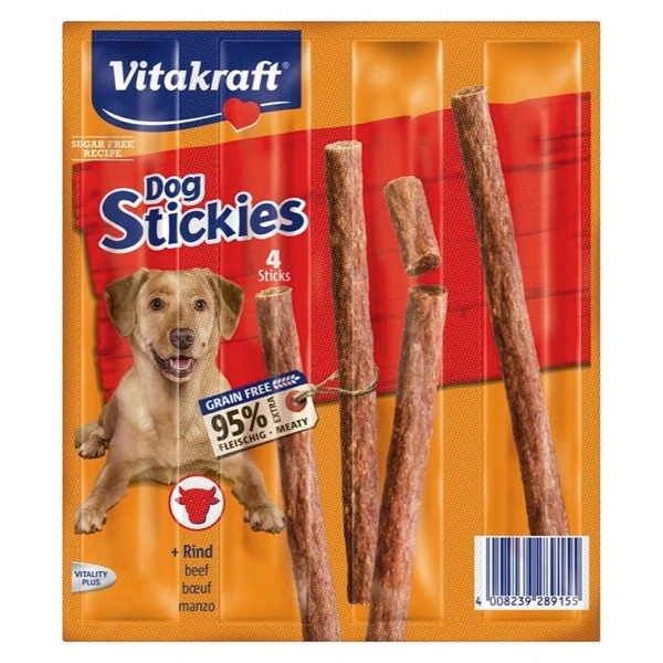 Ideale come stuzzichino e premio: Dog Stickies con manzo saporito. I prelibati Sticks sono senza zucchero e contengono abbondante carne di muscolo; confezionati singolarmente in confezione da 4.