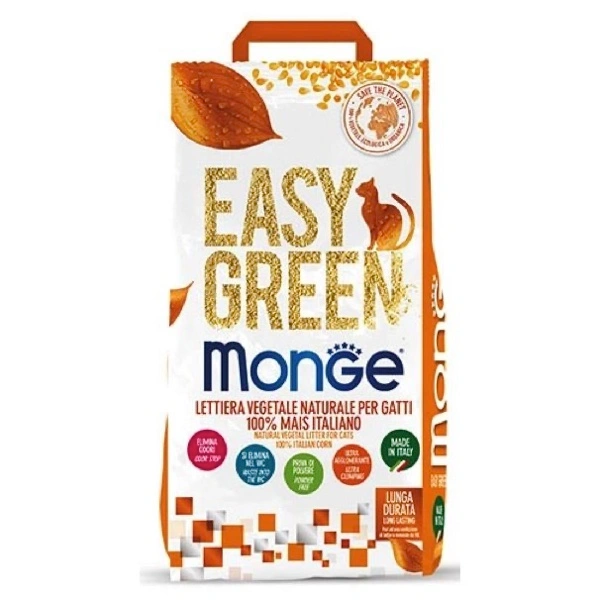 Easy Green 100% Mais è la nuova lettiera vegetale Naturale per gatti di Monge. È composta esclusivamente da mais 100% italiano. Ha la particolarità di essere “soft touch”: la suagranulometria è infatti piacevole al tatto del gatto. È ultra-agglomerante: in pochissimi secondi si può raccogliere la “palla” creata dall’urina del gatto. Non rilascia polveri quindi è adatta ai cuccioli.