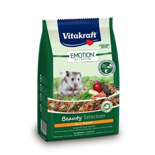 Cereali genuini, verdure salutari e mela fruttata: Emotion® Beauty Selection All Ages abbina un apporto nutritivo ottimale a un gusto delizioso e, grazie ai preziosi oli contenuti, contribuisce inoltre alla salute della pelle e alla lucentezza e bellezza del pelo dei criceti nani! La miscela equilibrata di questo alimento principale presenta ingredienti appositamente selezionati in base alle specifiche esigenze dei conigli nani e contiene, ad esempio, gustosi gamberetti che apportano importanti proteine a questi piccoli roditori. Anche i croccantini presenti nella miscela sono molto piccoli e compatti e pertanto particolarmente facili da consumare. Come tutti gli alimenti principali Emotion®, anche Emotion® Beauty Selection contiene naturalmente il TriVita®-Complex, l’innovativo complesso per garantire vitalità e salute ai criceti nani! Formulato da veterinari ed esperti di roditori! TriVita®-Complex: grazie alla presenza di DHA nelle alghe marine, Emotion® contiene uno degli acidi grassi Omega-3 più essenziali e biologicamente attivi, importante per la funzionalità cardiaca, cerebrale e per il sistema immunitario. L’inulina prebiotica promuove la salute della flora intestinale e una digestione ottimale. Il rapporto equilibrato di amminoacidi essenziali garantisce inoltre un’elevata valenza biologica. Per una vita sana a 360°!