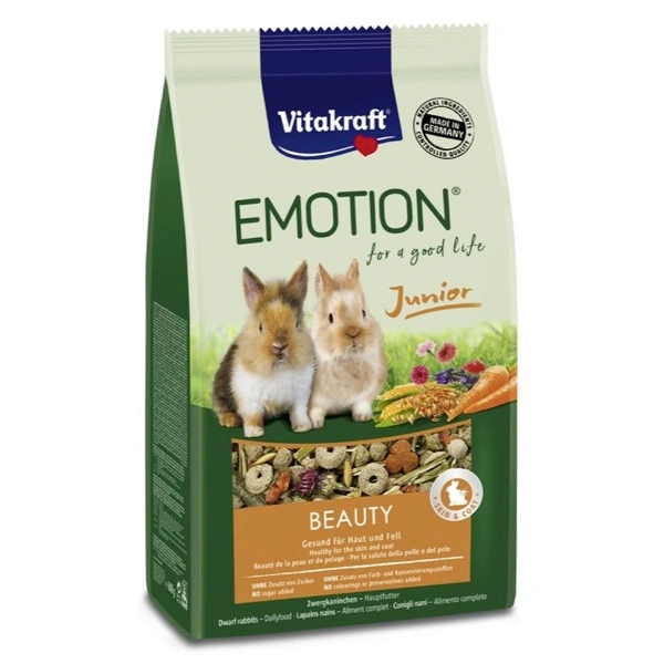 Erba medica ricca di fibre, croccanti carote, gustoso fiordaliso: Emotion® Beauty Selection Junior abbina un apporto nutritivo ottimale a un gusto delizioso e, grazie ai preziosi oli contenuti, contribuisce inoltre alla salute della pelle e alla lucentezza e bellezza del pelo dei conigli. La miscela equilibrata di questo alimento principale contiene ingredienti appositamente selezionati in base alle specifiche esigenze degli animali giovani in fase di crescita. I bocconcini contenuti nella miscela sono particolarmente piccoli e quindi facili da ingerire. Come tutti gli alimenti principali Emotion®, anche Emotion® Beauty Selection contiene naturalmente il TriVita®-Complex, l’innovativo complesso per garantire vitalità e salute ai conigli. Formulato da veterinari ed esperti di roditori! TriVita®-Complex: grazie alla presenza di DHA nelle alghe marine, Emotion® contiene uno degli acidi grassi Omega-3 più essenziali e biologicamente attivi, importante per la funzionalità cardiaca, cerebrale e per il sistema immunitario. L’inulina prebiotica promuove la salute della flora intestinale e una digestione ottimale. Il rapporto equilibrato di amminoacidi essenziali garantisce inoltre un’elevata valenza biologica. Per una vita sana a 360°!