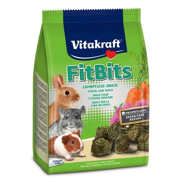Fit Bits, un sano passatempo da sgranocchiare per la cura dei denti! I cubetti di erba medica con appetitose carote e gustoso mais sono ricchi di fibra grezza e stimolano una masticazione prolungata. Olre ad essere indispensabile per una buona digestione dei vostri roditori, contribuisce al consumo necessario dei denti in continua crescita e mantiene una masticazione efficiente e denti sani!