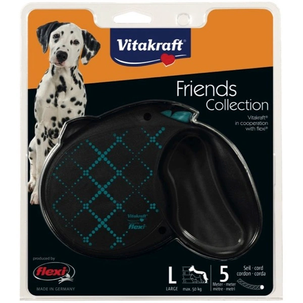 Questo guinzaglio allungabile a corda è adatto per passeggiate brevi o lunghe. Tutti i modelli dell’esclusiva “Friends Collection” convincono sia per la qualità elevata flexi® che per il look Vitakraft® trendy ma al tempo stesso discreto. Il sistema brevettato di frenata e riavvolgimento consente al cane un ampio margine di movimento controllato, nonostante il guinzaglio. La misura L ha una corsa di 5 m ed è adatta a tutti i cani di taglia grande fino a 50 kg. I pulsanti di frenata e di blocco sono di colore diverso rispetto al guscio. La maniglia integrata è ideale per tenere il cane al guinzaglio. E per maggiore sicurezza la cintura protettiva colorata è riflettente. Così siete sempre visibili all’imbrunire o nelle ore notturne!