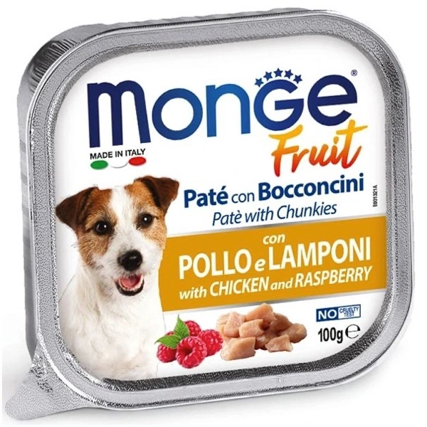 Alimento umido bilanciato completo destinato a cani adulti (1+) di tutte le razze e taglie, ideale per sostenerlo durante la vita quotidiana come pasto per cani di taglia piccola e come premio per quelli di taglia grande. Il patè ricco di bocconcini, è composto da pollo e lamponi. L’alimento è No cruelty test, privo di coloranti e conservanti aggiunti e Made in Italy.