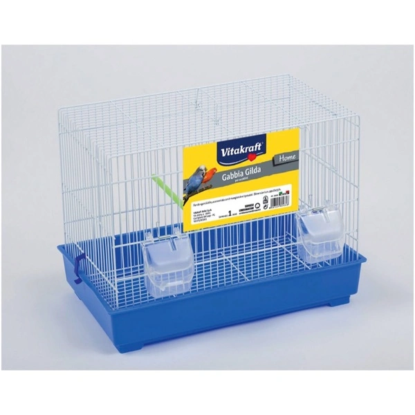 Gabbia per uccellini con fondo sganciabile, accessoriata con 2 mangiatoie e 2 posatoi.