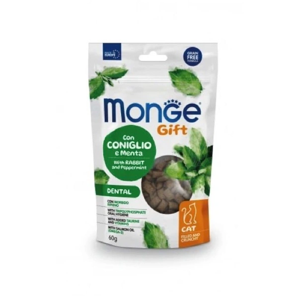 Alimento complementare destinato a gatti adulti. Specificatamente sviluppato per il benessere del tuo gatto grazie all’esterno croccante che include il tripolifosfato di sodio per il supporto dell’igiene dentale e un morbido ripieno alla menta per un alito fresco. Snack formulato senza cereali (Formula Grain free) e con un’unica fonte proteica di origine animale, coniglio fresco, ad alto valore biologico e digeribilità. Inoltre è addizionato con fattori promuoventi l’igiene e la salute del cavo orale come tripolifosfato di sodio per l’igiene orale, taurina, per il corretto funzionamento cardiaco e supporto al sistema visivo, vitamine, lievito di birra, come supporto immunitario, e l’olio di salmone ricco di omega-3. Made in Italy. No cruelty test. No coloranti e conservanti artificiali aggiunti.