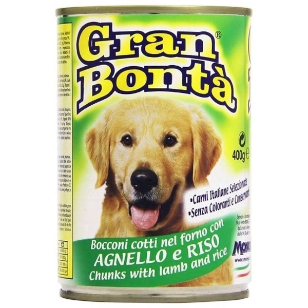 Alimento umido completo per cani adulti di tutte le taglie, costituito da bocconcini cotti al forno a base di agnello e riso, ricco in minerali e complesso vitaminico A-D3-E. Made in Italy. No cruelty test. Privo di conservanti e coloranti artificiali aggiunti.