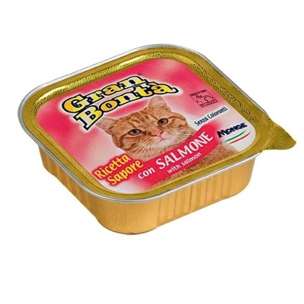 Alimento umido completo per gatti adulti, costituito da un patè cotto al vapore a base di salmone, ricco in minerali e vitamina E. Made in Italy. No cruelty test. Privo di conservanti e coloranti artificiali aggiunti.