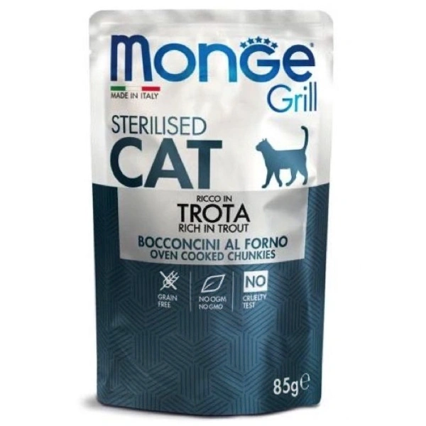 Alimento umido completo destinato a gatti adulti sterilizzati. Il prodotto si compone di bocconcini cotti al forno in gelatina, grain free; i carboidrati sono stati aggiunti mediante le patate. La trota italiana, una carne delicata e altamente digeribile, è Naturalmente ricca in vitamine essenziali e oligo-elementi. Il fegato aumenta l’appetibilità, che è particolarmente utile nei gatti più esigenti. La formulazione specifica alta in proteine e ridotta in grassi aiuta a mantenere una normale condizione corporea nei gatti sterilizzati predisposti a sviluppare sovrappeso o obesità. No coloranti e conservanti aggiunti.-100% made in Italy.