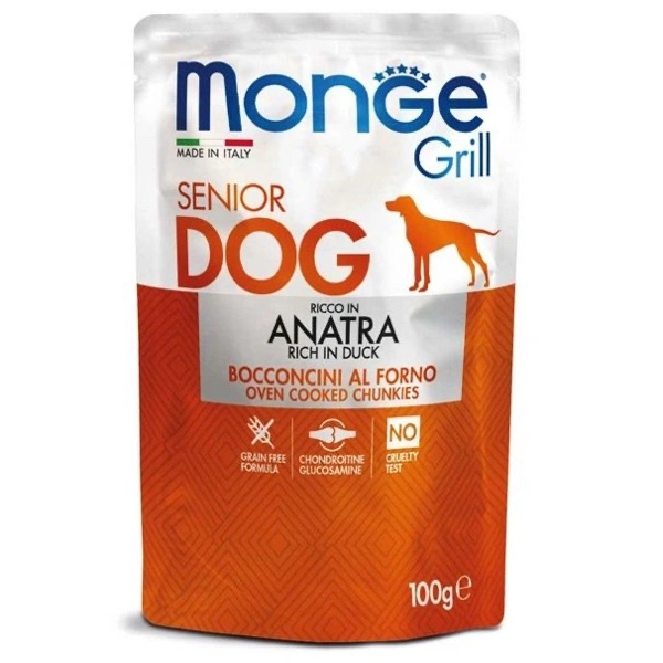 Alimento umido completo destinato a cani adulti senior.-Il prodotto si compone di bocconcini cotti al forno in gelatina, senza cereali e integrata con glucosamina e condroitina per il supporto articolare. No coloranti e conservanti aggiunti. No cruelty test.