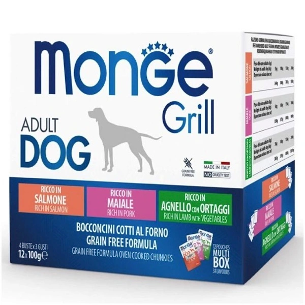 Alimento umido completo destinato a cani adulti. Una comoda box contenente 12 buste da 85 grammi l’uno di bocconcini dall’alta appetibilità cotti al forno in 3 diversi gusti, grain free, privi di conservanti e coloranti aggiunti. 100% Made in Italy.