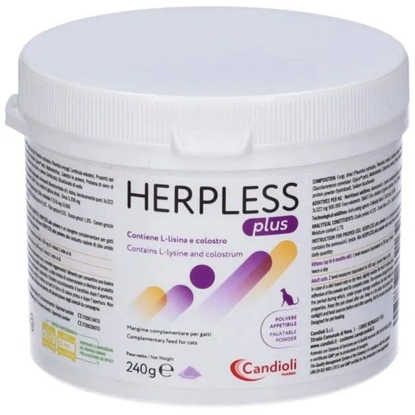 Candioli herpless plus polvere è un mangime complementare specifico per gatti, arricchito con l-lisina e colostro, pensato per supportare le difese immunitarie feline, in particolare in caso di infezione da herpes virus felino (fhv-1). Questo prodotto favorisce il benessere del gatto aiutando a ridurre la gravità e la frequenza degli episodi infettivi, integrando efficacemente le terapie veterinarie.