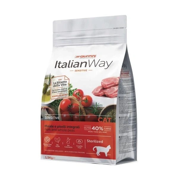 alimento secco completo e bilanciato, progettato per soddisfare le esigenze nutrizionali dei gatti adulti sterilizzati, in particolare quelli con intestini delicati. La ricetta gluten-free contiene il 40% di carne di maiale (14% fresca), fornendo proteine di alta qualità e facilmente digeribili. L’integrazione con piselli integrali (10%) contribuisce a un apporto equilibrato di fibre e carboidrati, mentre l’uso di pomodoro disidratato e olio di rosmarino offre antiossidanti naturali che supportano la salute generale del gatto. Inoltre, la presenza di metionina aiuta a mantenere la funzionalità renale, e l’aggiunta di taurina supporta la salute cardiaca.