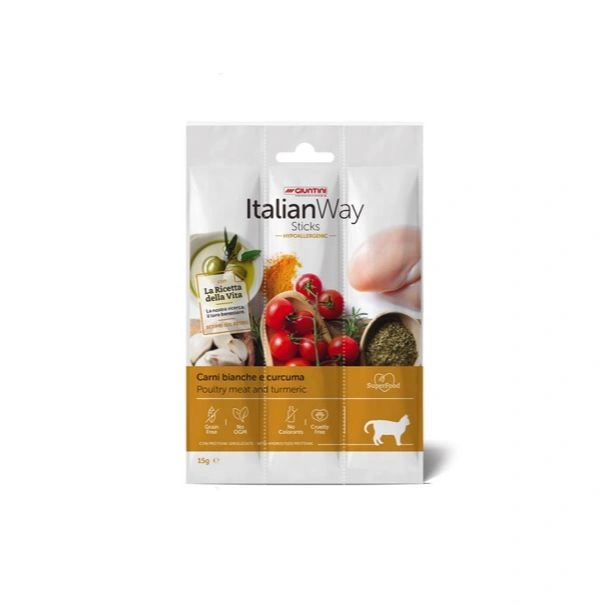 Snack ipoallergenico pensato per gatti adulti. Questo stick è privo di cereali e zuccheri aggiunti, rendendolo adatto anche a gatti con sensibilità alimentari. La sua composizione include carni bianche fresche (pollo e tacchino), gelatina, proteine idrolizzate, e una piccola quantità di curcuma (0,3%), nota per le sue proprietà antinfiammatorie e digestive. L’olio di oliva (2 g/kg) contribuisce al benessere della pelle e del pelo del gatto. L’aglio essiccato (0,1 g/kg) e gli oli essenziali di rosmarino e origano (8 mg/kg e 1 mg/kg rispettivamente) offrono proprietà antiossidanti naturali. Inoltre, il pomodoro disidratato (1 g/kg) fornisce vitamine e minerali essenziali. Le dosi giornaliere consigliate variano in base all’età del gatto: fino a 3 sticks per gatti junior, fino a 5 per adulti e fino a 4 per gatti senior. È importante lasciare sempre a disposizione una ciotola con acqua fresca e pulita.