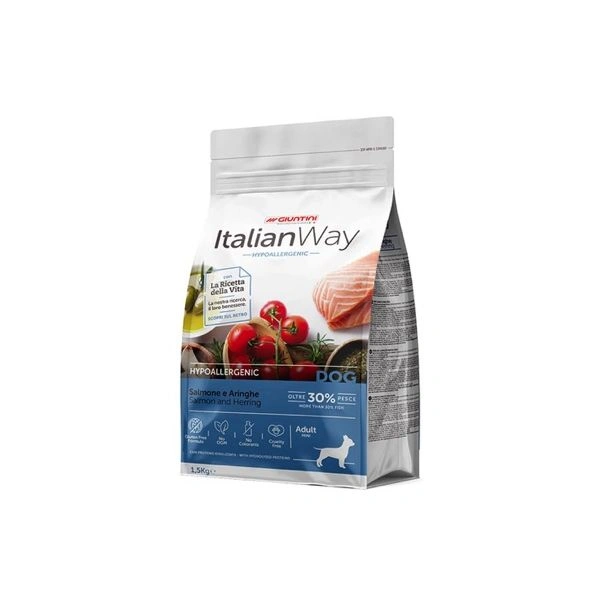 Alimento secco completo e bilanciato pensato per cani di taglia piccola con sensibilità alimentari o intolleranze. La sua formula ipoallergenica utilizza proteine selezionate provenienti dal salmone e dall’aringa, ingredienti altamente digeribili e ricchi di nutrienti essenziali che favoriscono il benessere del tuo piccolo amico. Questo cibo secco è privo di cereali, riducendo il rischio di reazioni allergiche e supportando una digestione ottimale. Grazie agli acidi grassi omega naturalmente presenti nel pesce, aiuta a mantenere la pelle sana e il pelo lucido. Prodotto con cura in Italia, Italian Way Mini Hypoallergenic Salmone e Aringa offre una dieta gustosa, sana e completa per i cani più delicati.