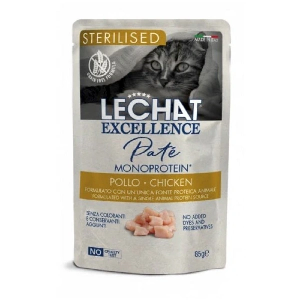 Alimento umido completo e bilanciato destinato a gatti adulti sterilizzati. Il patè è stato formulato con una singola fonte proteica, il pollo, senza l’aggiunta di cereali (Grain free). Made in Italy. No cruelty test. Privo di conservanti artificiali aggiunti.