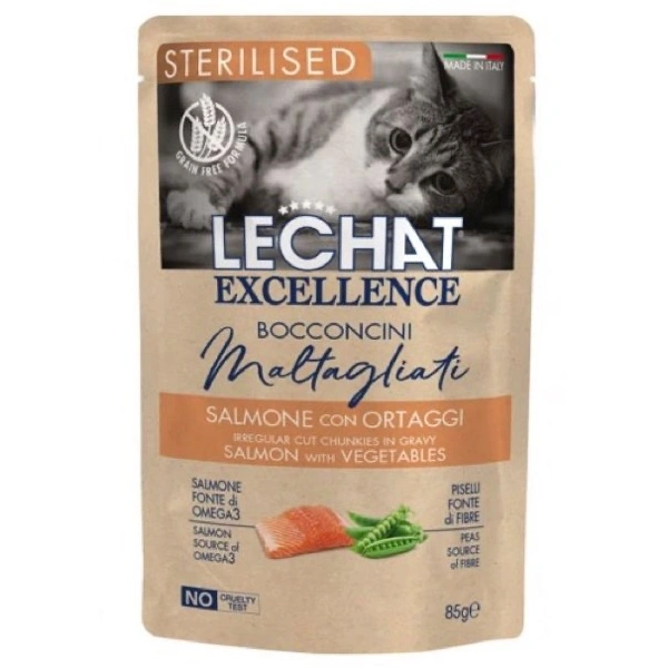 Alimento umido completo e bilanciato destinato a gatti adulti. I bocconcini maltagliati in salsa sono costituiti da una fonte di carboidrati alternativa, i piselli, e da salmone, fonte di acidi grassi omega-3 per favorire il benessere e la lucentezza del pelo. Made in Italy. No cruelty test. Privo di conservanti artificiali aggiunti.