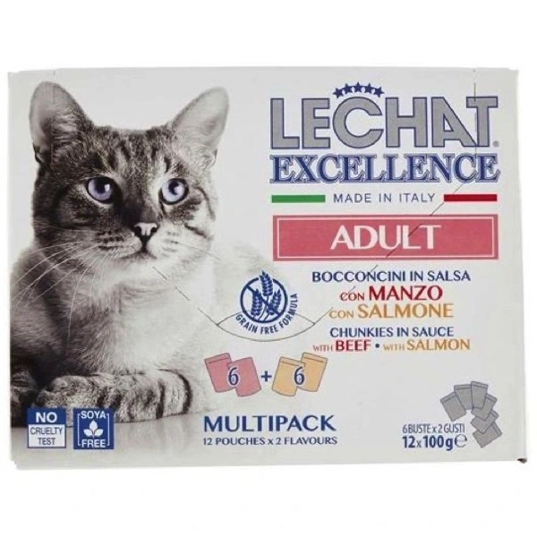 Comodo multipack contenente 12 bustine da 100 grammi l’una di gustosi bocconcini in salsa destinati a gatti adulti sterilizzati. Metà delle buste hanno come ingrediente principale il manzo, mentre l’altra metà il salmone, in modo da offrire un alimento completo e variegato come dieta quotidiana.