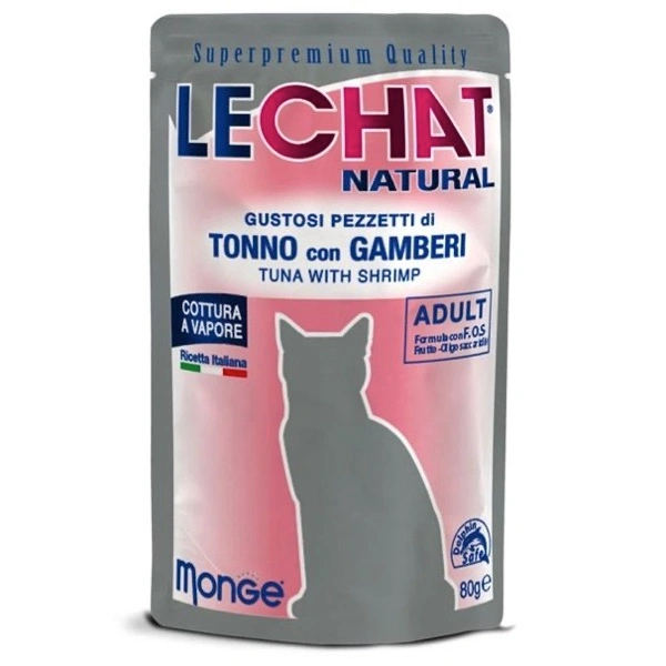 Alimento umido complementare per gatti adulti. I pezzetti di tonno e gamberetti cotti al vapore, presentano proteine ad elevato valore biologico, arricchito con FOS (frutto-oligosaccaridi), prebiotici per il benessere intestinale, ricco di omega-3 e omega-6 per un mantello brillante. Senza coloranti e conservanti artificiali aggiunti. No cruelty test.