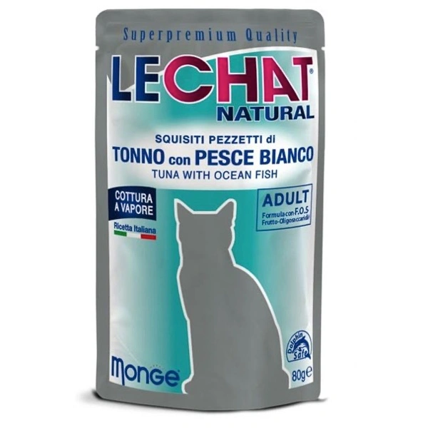 Alimento umido complementare per gatti adulti. I pezzetti di tonno e pesce bianco cotti al vapore, presentano proteine ad elevato valore biologico, arricchito con FOS (frutto-oligosaccaridi), prebiotici per il benessere intestinale, ricco di omega-3 e omega-6 per un mantello brillante. Senza coloranti e conservanti artificiali aggiunti. No cruelty test.