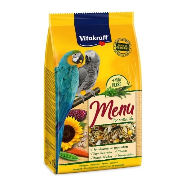 Menu è il nostro rinomato e testato alimento principale con preziosi semi, noci, mais rosso e pezzetti di carota per un’alimentazione completa e sana dei pappagalli. Arricchito con VITA® HERBS, una selezione accurata di preziose erbe come prezzemolo, piantaggine e timo, che possono favorire il benessere. Una miscela specifica e bilanciata che piace agli animali e fornisce loro tutto ciò di cui hanno bisogno per una vita sana! Questo è il nostro impegno per la qualità del Menu®Vitakraft®: l’alimento è perfettamente calibrato per le esigenze nutrizionali degli animali e convince per gli ingredienti naturali di alta qualità, che sono anche visibili attraverso la finestra della confezione. Realizzato naturalmente senza coloranti e conservanti, con ricetta senza zucchero. + Vitamine essenziali: per un’alimentazione ottimale e la prevenzione di carenze alimentari.+ Immun Aktiv: i betaglucani favoriscono il sistema immunitario e rafforzano le difese degli uccelli. + Minerali e iodio: adeguato apporto di minerali, iodio e altri oligoelementi per favorire il sistema metabolico.