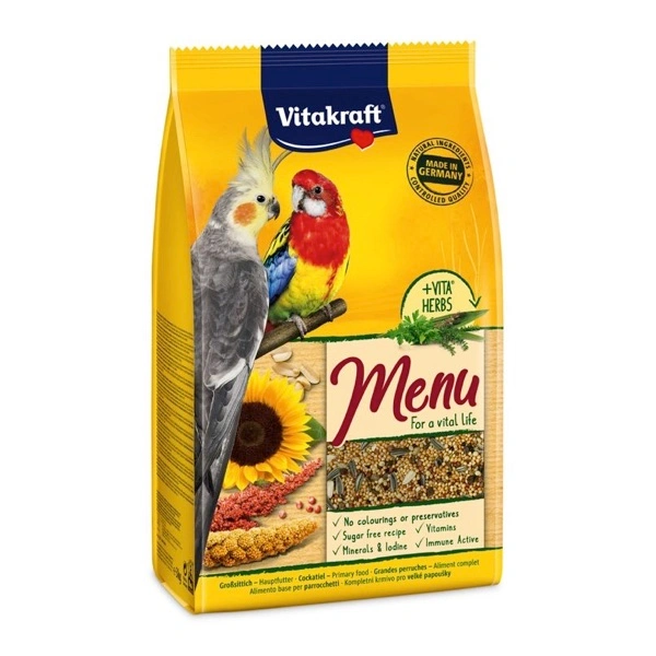 Menu è il nostro rinomato e testato alimento principale con preziosi semi, cereali maturati al sole e gustose noci per un’alimentazione completa e sana dei parrocchetti. Arricchito con VITA® HERBS, una selezione accurata di preziose erbe come prezzemolo, piantaggine e timo, che possono favorire il benessere. Una miscela specifica e bilanciata che piace agli animali e fornisce loro tutto ciò di cui hanno bisogno per una vita sana! Questo è il nostro impegno per la qualità del Menu Vitakraft®: l’alimento è perfettamente calibrato per le esigenze nutrizionali degli animali e convince per gli ingredienti naturali di alta qualità, che sono anche visibili attraverso la finestra della confezione. Realizzato naturalmente senza coloranti e conservanti, con ricetta senza zucchero. + Vitamine essenziali: per un’alimentazione ottimale e la prevenzione di carenze alimentari.+ Immun Aktiv: i betaglucani favoriscono il sistema immunitario e rafforzano le difese degli uccelli. + Minerali e iodio: adeguato apporto di minerali, iodio e altri oligoelementi per favorire il sistema metabolico.