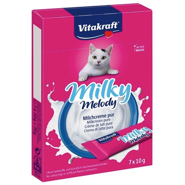 I gatti adorano Milky Melody! La deliziosa crema contiene sano latte ed è calibrata per le esigenze dei gatti, è a basso contenuto di lattosio. Molto pratico: lo snack è porzionato in confezioni singole che potete utilizzare secondo le esigenze del vostro micio. A differenza del latte per gatti, Milky Melody non deve essere conservato in frigorifero né riscaldato. Delizia cremosa al latte!