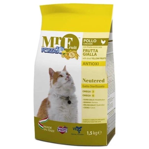 Alimento secco completo destinato a gatti adulti castrati. La dieta è formulata per avere un basso contenuto in grassi e un apporto controllato di minerali, co-responsabili della formazione dei calcoli urinari. L’addizione della frutta gialla ha lo scopo di potenziare l’azione degli ingredienti. Notare bene: i prodotti carnei provengono esclusivamente da allevamenti estensivi.
