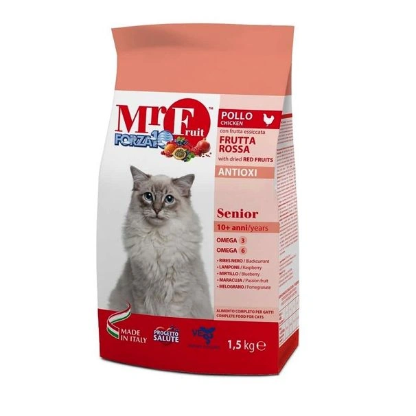 Alimento secco completo destinato a gatti adulti senior. La formulazione è tale da garantire un controllo nell’apporto proteico e dei grassi, inoltre la presenza di frutta secco rafforza, mediante le sue proprietà, il metabolismo dei nutrienti, proteggendo i vari organi. Notare bene: i prodotti carnei provengono esclusivamente da allevamenti estensivi.