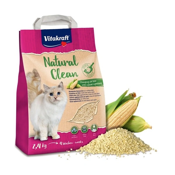 Natural Clean: lettiera agglomerante al mais prodotta con materie prime naturali. L’impiego di materie prime prevalentemente rinnovabili tutela l’ambiente e coccola il vostro gatto con un’igiene ecosostenibile. I pellet di mais chiari e piccoli assorbono liquidi e odori abbondantemente e a lungo, formando agglomerati solidi che possono essere semplicemente rimossi. La lettiera deve essere sostituita solo per la quantità sporca che è stata rimossa, fino alla sostituzione completa quando necessario. Natural Clean è molto conveniente per i consumij.