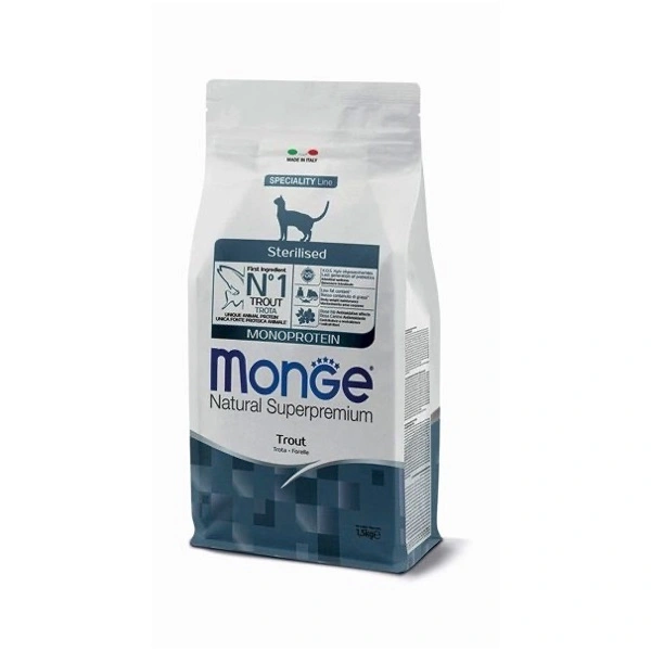 Alimento secco dietetico completo e bilanciato destinato a gatti adulti sterilizzati. Il principale ingrediente è la trota, unica fonte proteica, altamente appetibile e digeribile. La formulazione è arricchita da XOS (xilo-oligosaccaridi) prebiotici per il benessere intestinale, e ulteriori integrazioni come la rosa canina, con effetti antiossidanti, yucca shidigera per il controllo degli odori intestinali. Privo di coloranti e conservanti artificiali aggiunti.