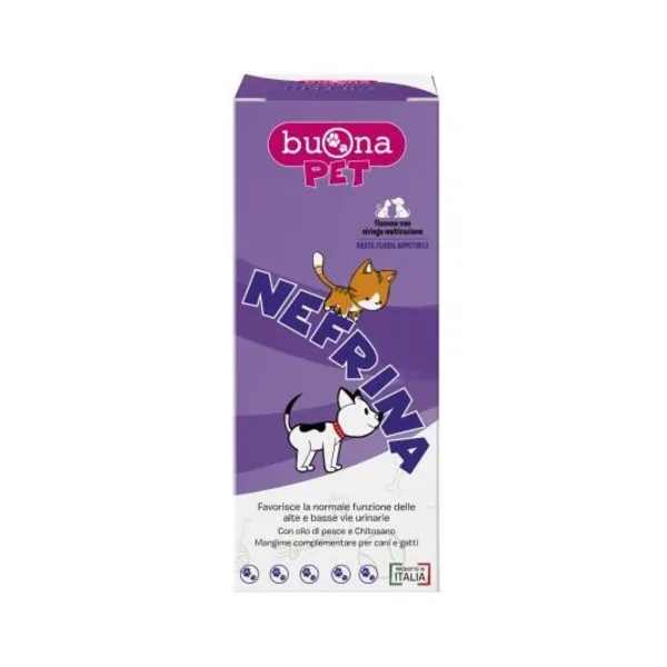 Nefrina flacone è un mangime complementare per cani e gatti formulato in pasta fluida appetibile con olio di pesce fonte di EPA e DHA, chitosano e vitamina A per supportare la normale funzione renale e dell’apparato urinario. L’utilizzo della siringa multirazione consente un’accurata e facile somministrazione quotidiana.