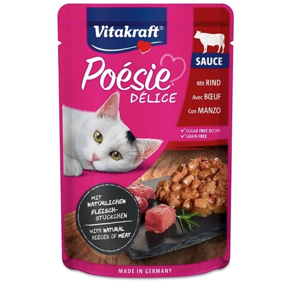 Questi deliziosi bocconcini dal gusto unico con saporito manzo in abbondante salsa delicata sono un’autentica prelibatezza per i gatti. Poésie® Déli Sauce con pezzetti di carne naturali, ad alto valore nutrizionale, il vostro gatto li adorerà. I migliori ingredienti assicurano la qualità elevata e sono perfettamente calibrati per le esigenze nutrizionali del gatto. Anche il vostro micio non potrà farne a meno. Vitakraft. Dall’amore per gli animali.