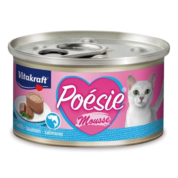 Mousse leggera e vaporosa con gustoso salmone, questa invitante prelibatezza è una vera poesia per il vostro gatto! Poésie® Mousse delizierà ogni giorno il vostro micio con il suo gusto irresistibile e squisito, che si scioglie sulla lingua a poco a poco. Tutte le varietà sono ideali per le esigenze nutrizionali dei gatti e preparate con i migliori ingredienti secondo una ricetta senza zucchero. E, naturalmente, di altissima qualità. Vitakraft. Dall’amore per gli animali.