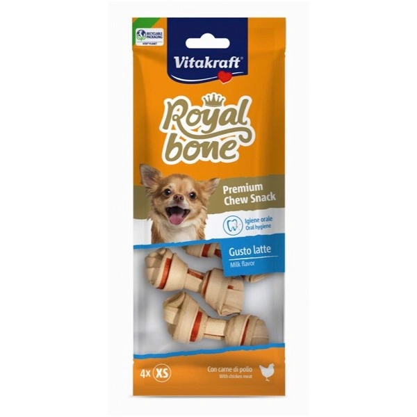 Alimento complementare per cani al gusto latte. Royal Bone, i masticativi di nuova generazione: gustosi, ideali per l’igiene orale e facilmente digeribili anche per cuccioli. Non lasciano residui e possono essere ingeriti. Speciale formulazione 2 in 1: consistenza che rafforza denti e muscoli masticatori e contenuto di pollo che rende il prodotto molto più appetibile dei normali masticativi. Contiene proteine animali.