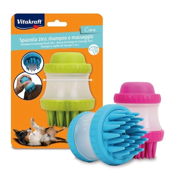 Spazzola 2in1 shampoo e massaggio: Spazzola ideale per fare lo shampoo e un piacevole massaggio. Il serbatoio che contiene lo shampoo consente un lavaggio veloce ed accurato del manto grazie alle morbide setole che raggiungono la cute dell’animale.
