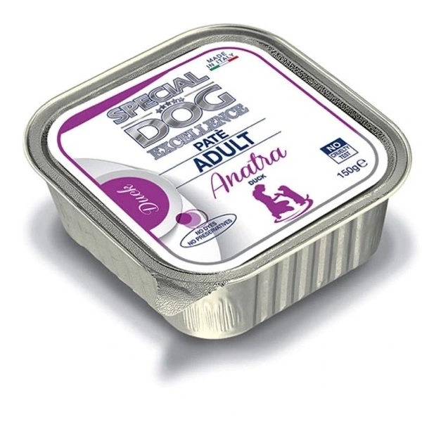 Alimento umido completo destinato a cani adulti, tra 1 e 8 anni d’età. Il patè a base di anatra cotto al vapore, garantisce una nutrizione bilanciata e idonea per il benessere quotidiano del tuo animale nel rispetto dei suoi fabbisogni. Made in Italy. No cruelty test. No conservanti e coloranti artificiali e zuccheri aggiunti.