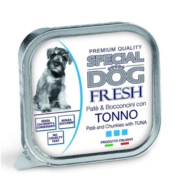 Alimento umido completo destinato a cani adulti. È composto da deliziosi bocconcini, cotti al forno, e patè, cotto al vapore, a base di tonno, addizionati con un complesso di vitamine A-D3-E. Privi di conservanti e coloranti artificiali aggiunti, ottimi per garantire il corretto nutrimento quotidiano. Made in Italy. No cruelty test.