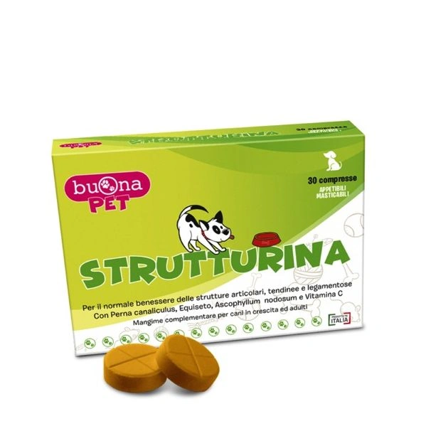 Strutturina è un mangime complementare per cani in crescita e adulti, formulato per favorire il benessere delle strutture articolari, tendinee e legamentose. Ricco di Perna canaliculus, Equiseto, Alga Ascophyllum nodosum e Vitamina C, Strutturina contribuisce a mantenere la mobilità, la flessibilità e la salute delle articolazioni del cane.