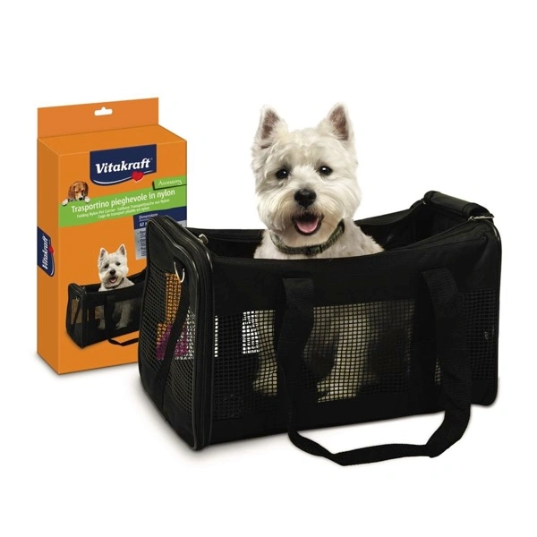 Trasportino pieghevole in nylon. Adatto a cani di taglia piccola, gatti e piccoli animali domestici fino a 12 kg. Il trasportino è dotato di maniglie e una tracolla removibile, si apre nelle parti anteriore e superiore e ha inserti in rete che permettono una visibilità a 360°, una buona circolazione dell’aria e consentono di controllare il tuo animale. Questo leggero trasportino ha delle pratiche tasche laterali, un fondo removibile e può essere ripiegato completamente per essere riposto.