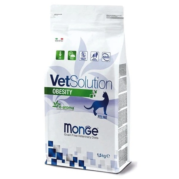 Monge VetSolution Obesity Feline è un alimento dietetico completo per gatti formulato per la riduzione dell’eccesso di peso corporeo. Contiene concentrato di succo di melone per neutralizzare i radicali liberi, semi di piantaggine per ritardare lo svuotamento gastrico e indurre la sazietà e Xilo-oligosaccaridi (XOS) per preservare il microbiota intestinale. La formulazione è caratterizzata da un basso potere energetico. Si raccomanda di chiedere un consulto al proprio veterinario prima dell’uso.